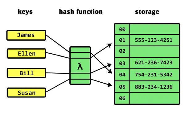 - Función hash: Transforma la clave en un índice que se usa para almacenar o recuperar el valor asociado.