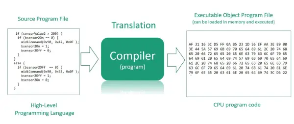 Los compiladores son programas que necesitan un archivo que contiene el código fuente (source code) y luego ejecutan el proceso de traducción del código fuente a lenguaje máquina (proceso de compilación). El código máquina resultante se coloca en un nuevo archivo para su ejecución posterior. Este archivo se suele denominar fichero binario ejecutable.