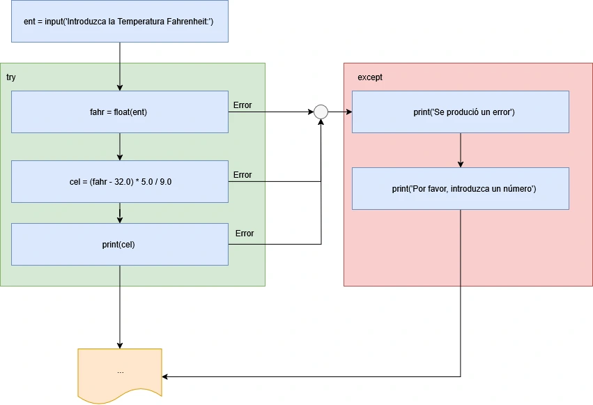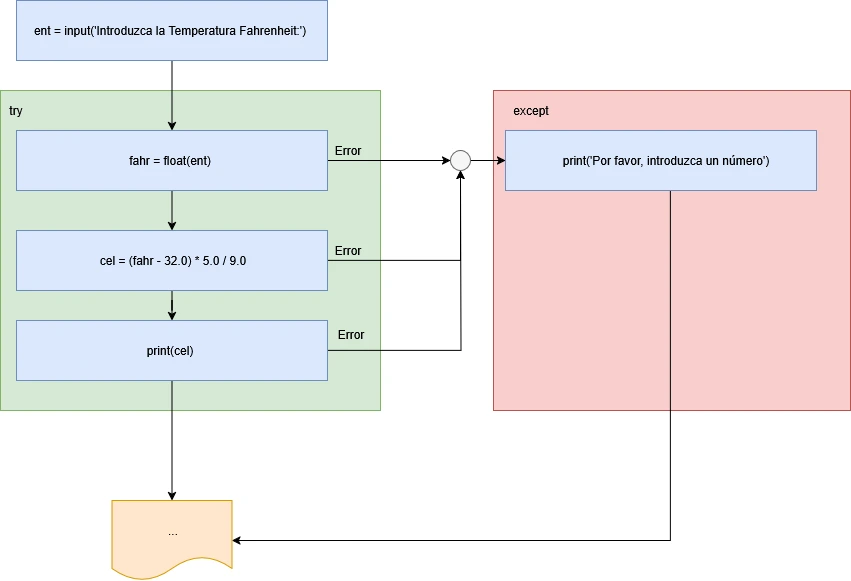 Python comienza ejecutando la secuencia de sentencias del bloque try. Si todo va bien, se saltará todo el bloque except y terminará. Si ocurre una excepción dentro del bloque try, Python saltará fuera de ese bloque y se ejecutará la secuencia de sentencias del bloque except.