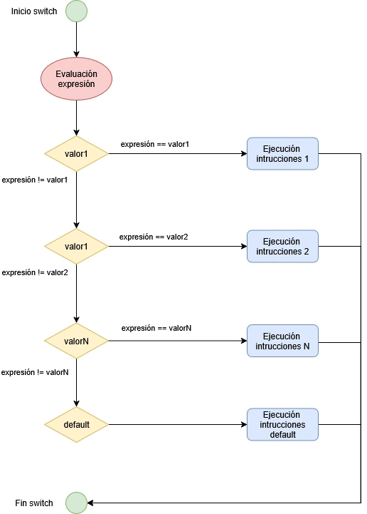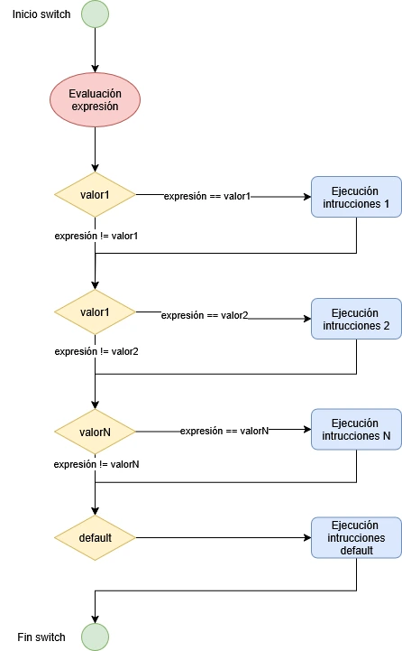 La evaluación de la expresión debe dar un resultado entero, convertible a entero o valor de tipo String. La cláusula default es opcional. La dinámica del switch es la siguiente: